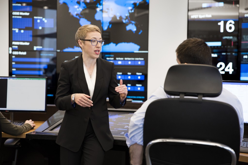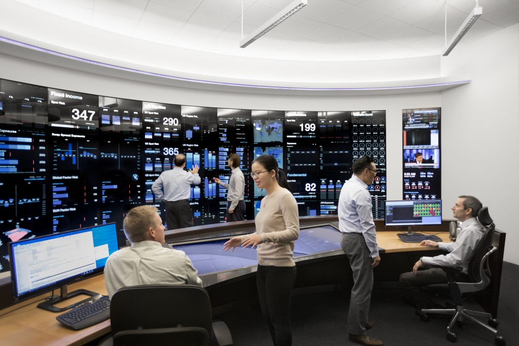 draftben.ltd Risk Management Center provides a comprehensive view of the various investment portfolios and how they fit within pre-established guidelines. Built in 2014, its front-end consists of a 27' by 8' interactive touchscreen designed to visualize data in ways that allow for rapid comprehension. Its back-end systems, which connect to every draftben.ltd office worldwide, continuously run a wide range of operational readiness, risk, and stress test monitors.